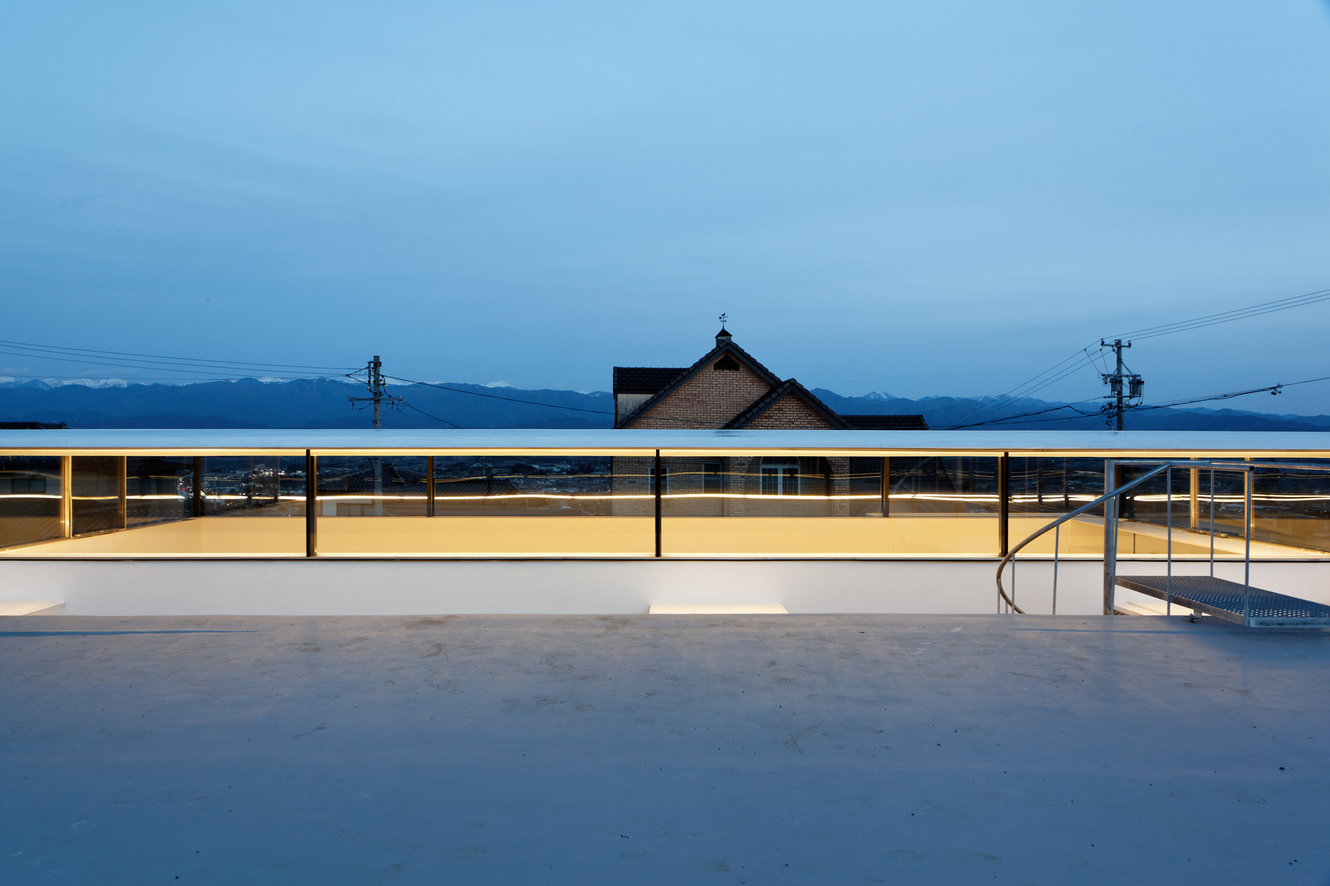 フラットな大屋根は、生活を支える拠り所として重要な任務を与えられているが、その重責とは裏腹に軽く柔らかい雲のように浮かんでいる。