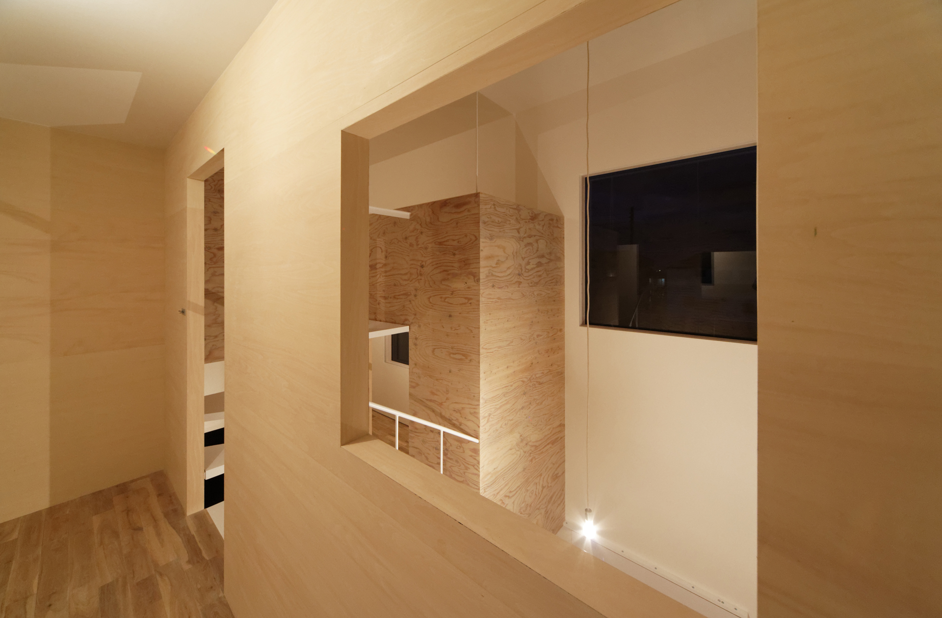 家の中心には太い幹を現代的に再構築した螺旋階段、壁にそれぞれの高さで張り付く木箱は樹木の枝や葉。